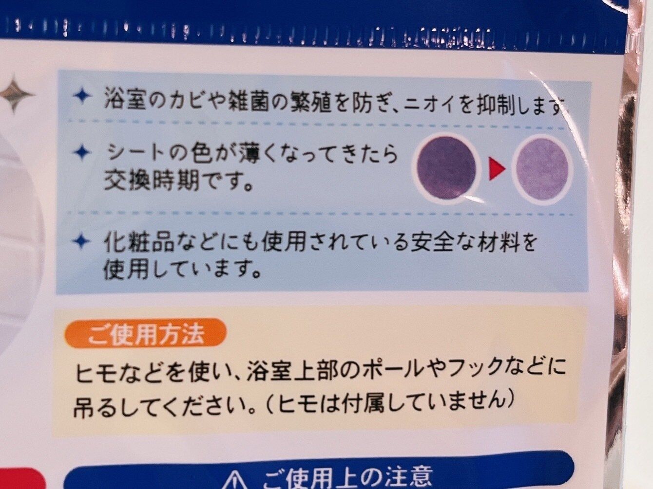 シートの色が変わるので、シート交換時期も分かって助かります。使用期間の目安は約1か月です。お風呂の広さが1坪の広さであれば、シート1枚でOK。お風呂の広さによって、枚数は調整してみてください。