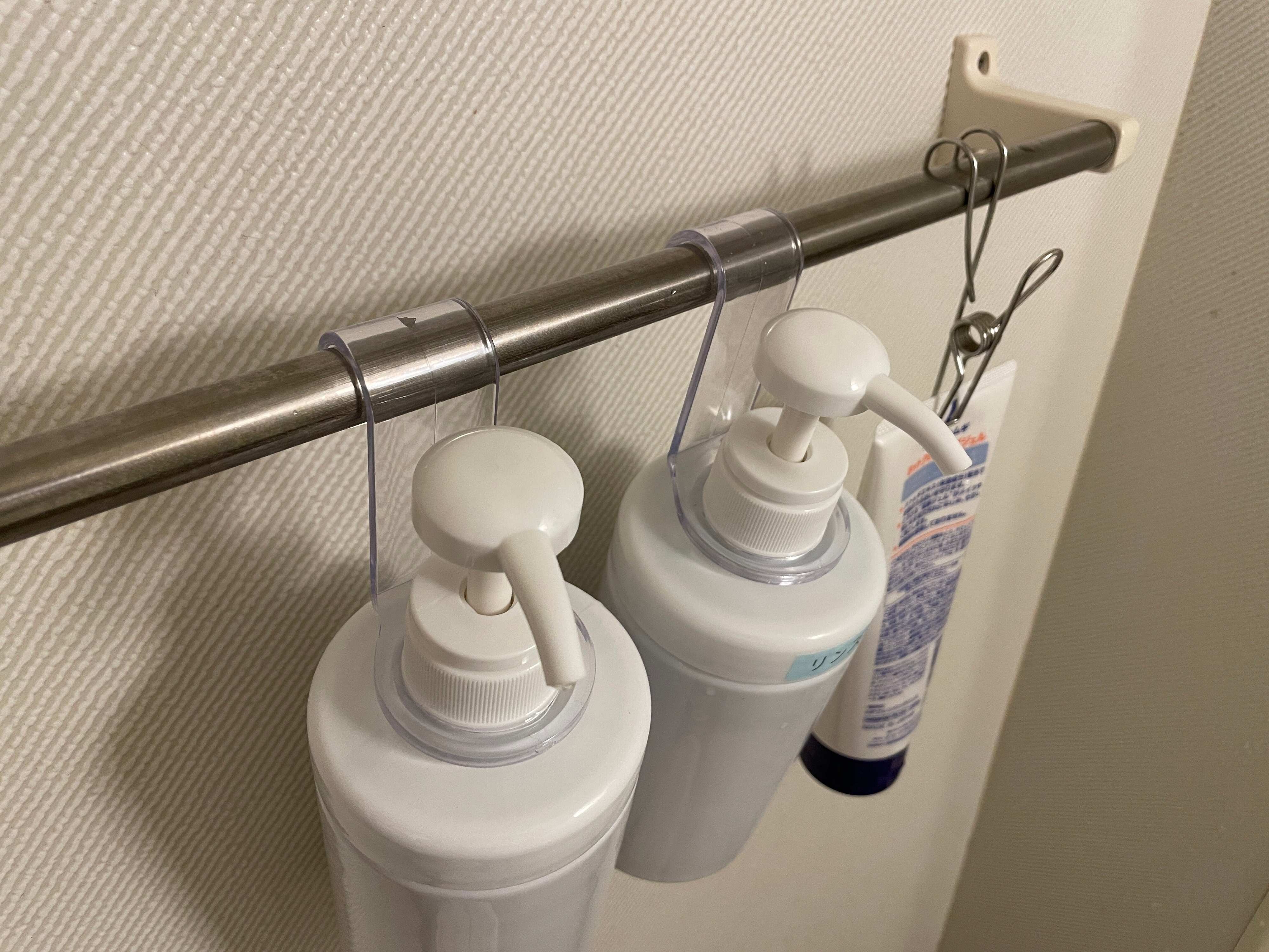 引っかけたままポンプは押せないので、シャンプーを使うときだけ下ろし、使用後はまた引っかければ、清潔なまま使用できますよ。