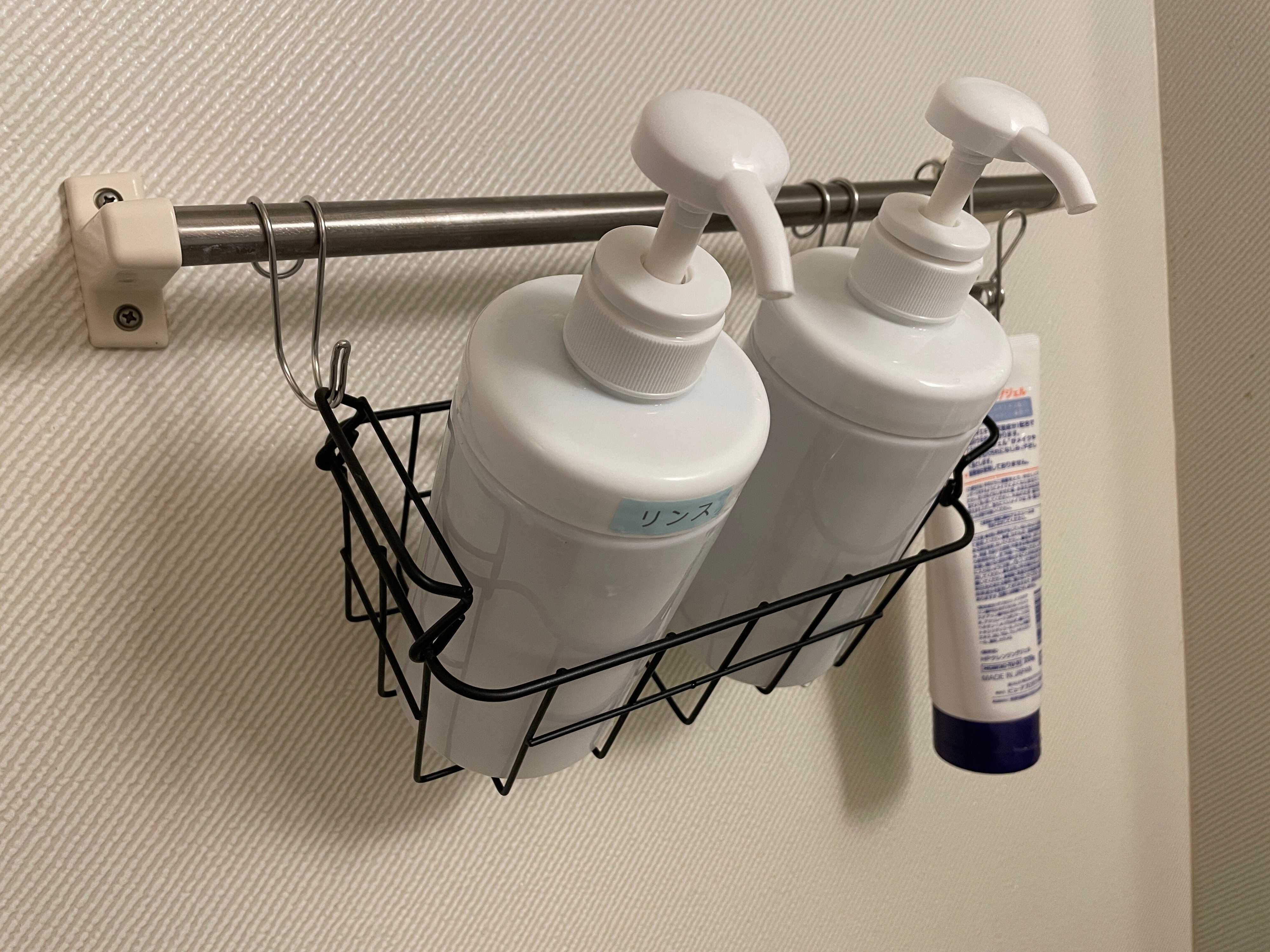 ひとつひとつのボトルにフックをかけたりするのが面倒なら、シャンプーを入れたバスケットごと吊るす方法もあります。