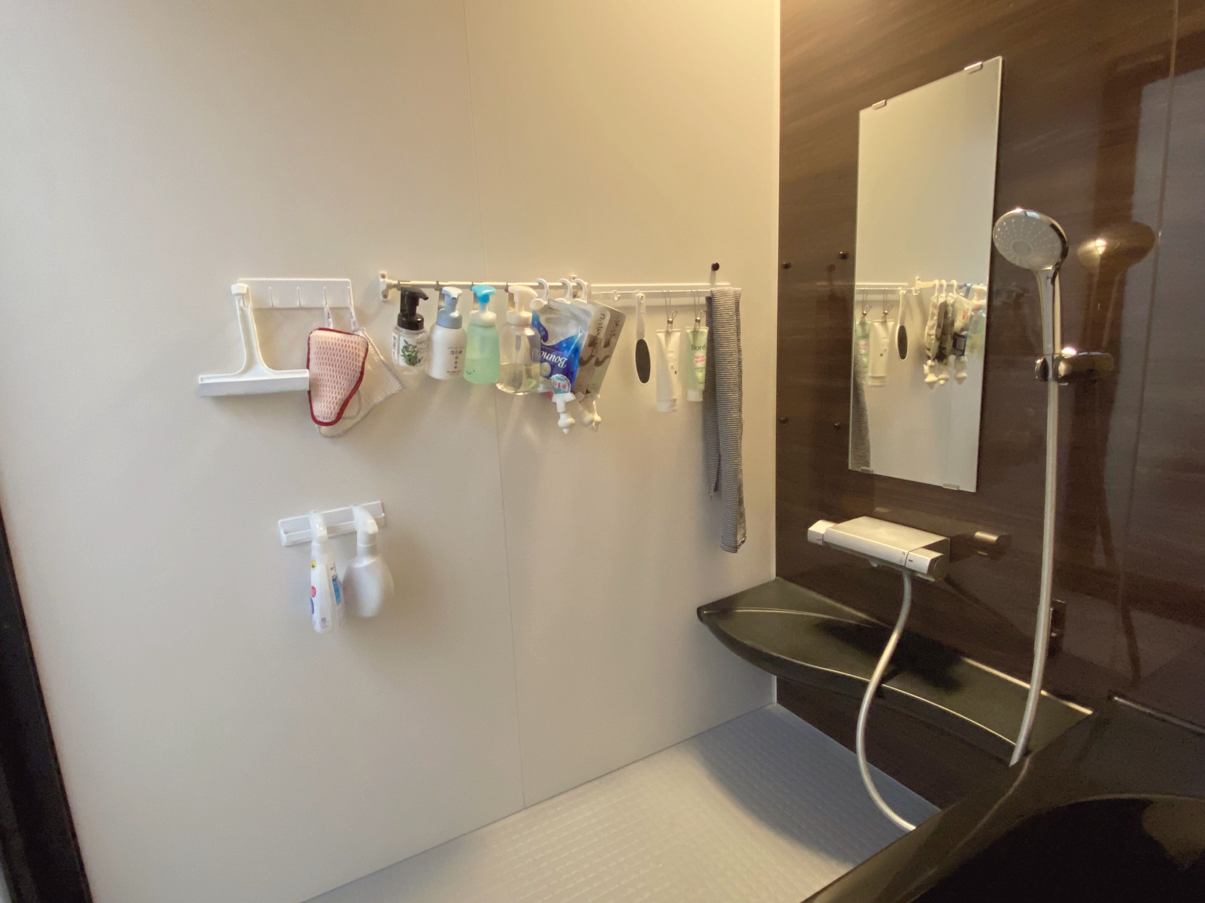 掃除の大変なお風呂は備えつけの棚を取り外し、簡単に取りつけ可能なマグネットの収納アイテムを利用して吊り下げる工夫をしています。