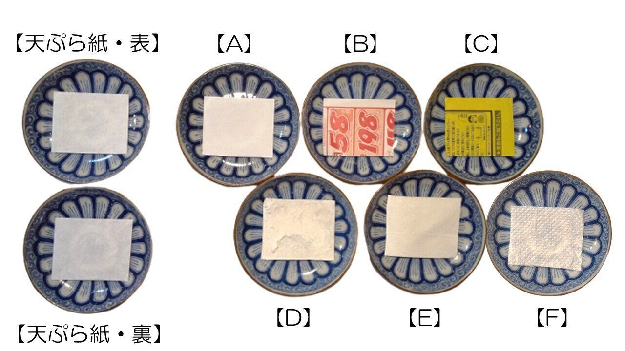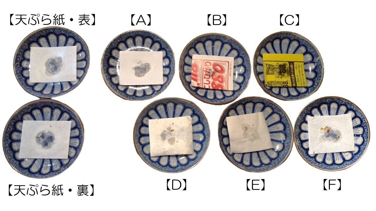 先ほどの比較では、できるだけ油脂を吸い取りたいときにおすすめの紙類がわかりましたが、「天ぷら紙」には食器を汚しにくいことも期待される役割の一つです。