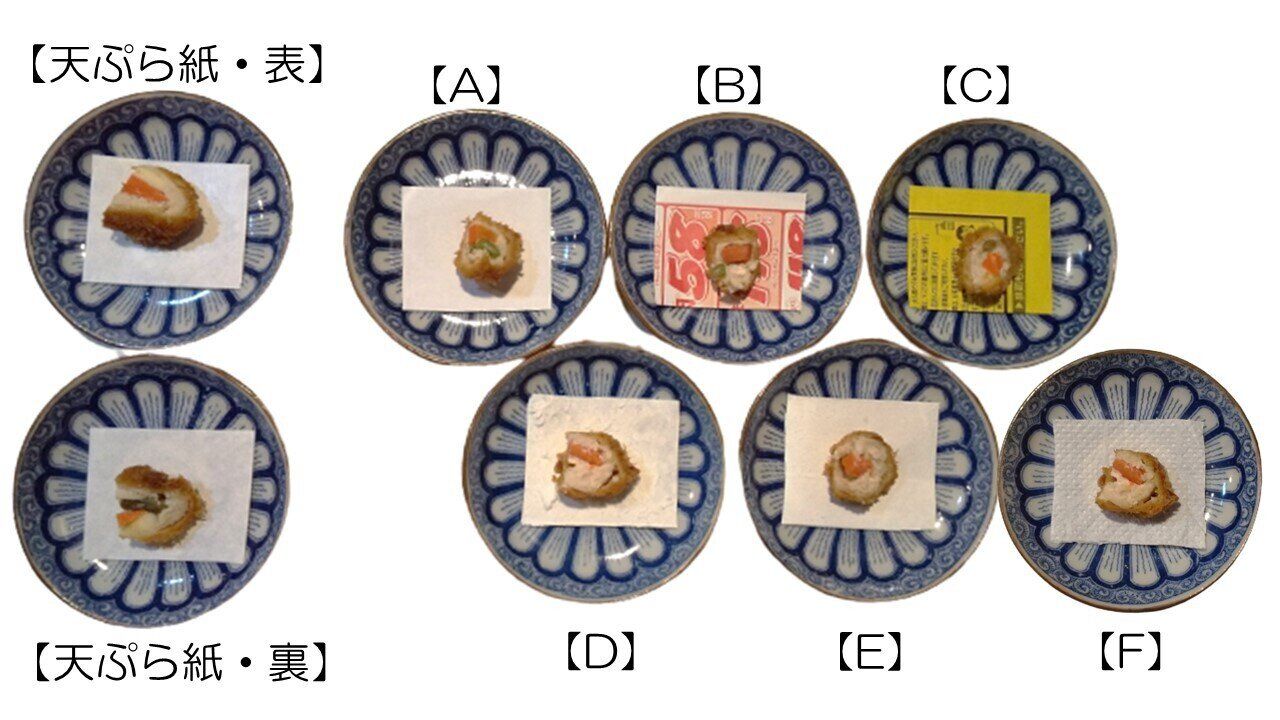 すべての紙類に、冷めた揚げ物をそれぞれのせて油の染みこみ具合を確認してみることに。