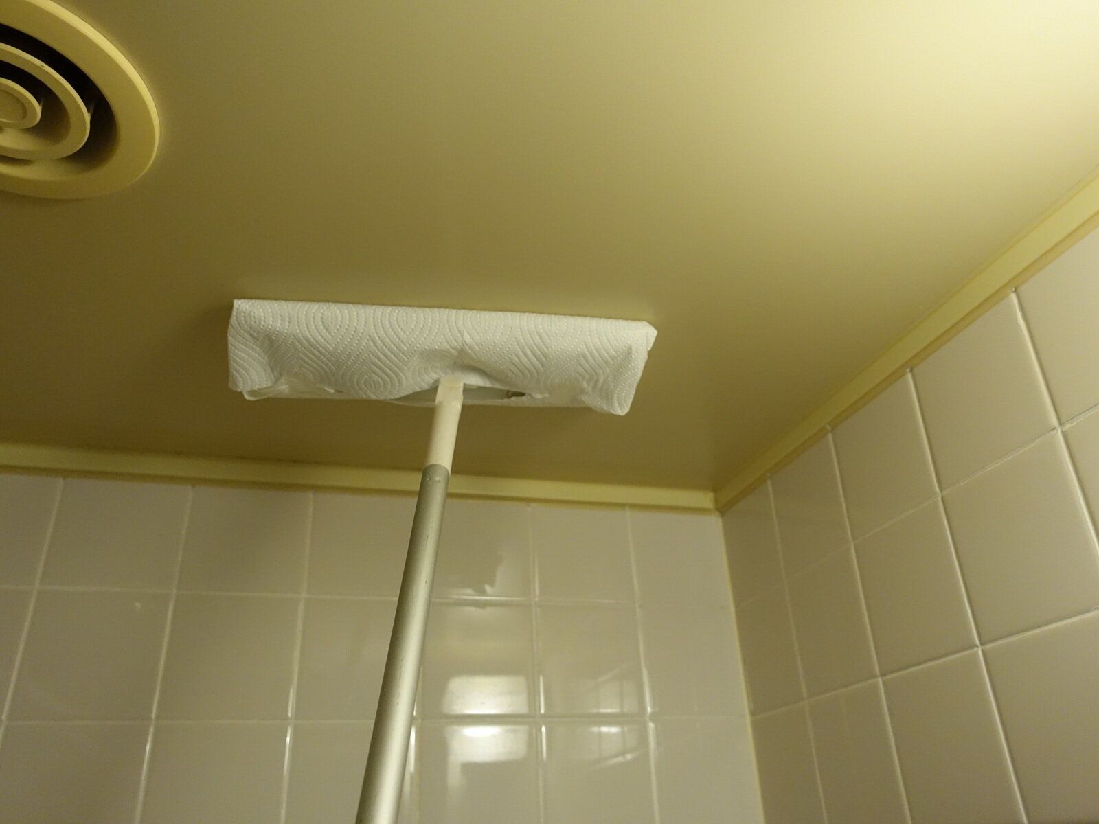 フロアモップを使うと簡単に天井まで届くので便利です。先にキッチンペーパーを巻きつけ、洗剤を吹きつけて天井を拭きましょう。けっこう簡単に汚れが落ちます。カビがある場合はカビ取り洗剤を吹きつけてこすってもいいですね。