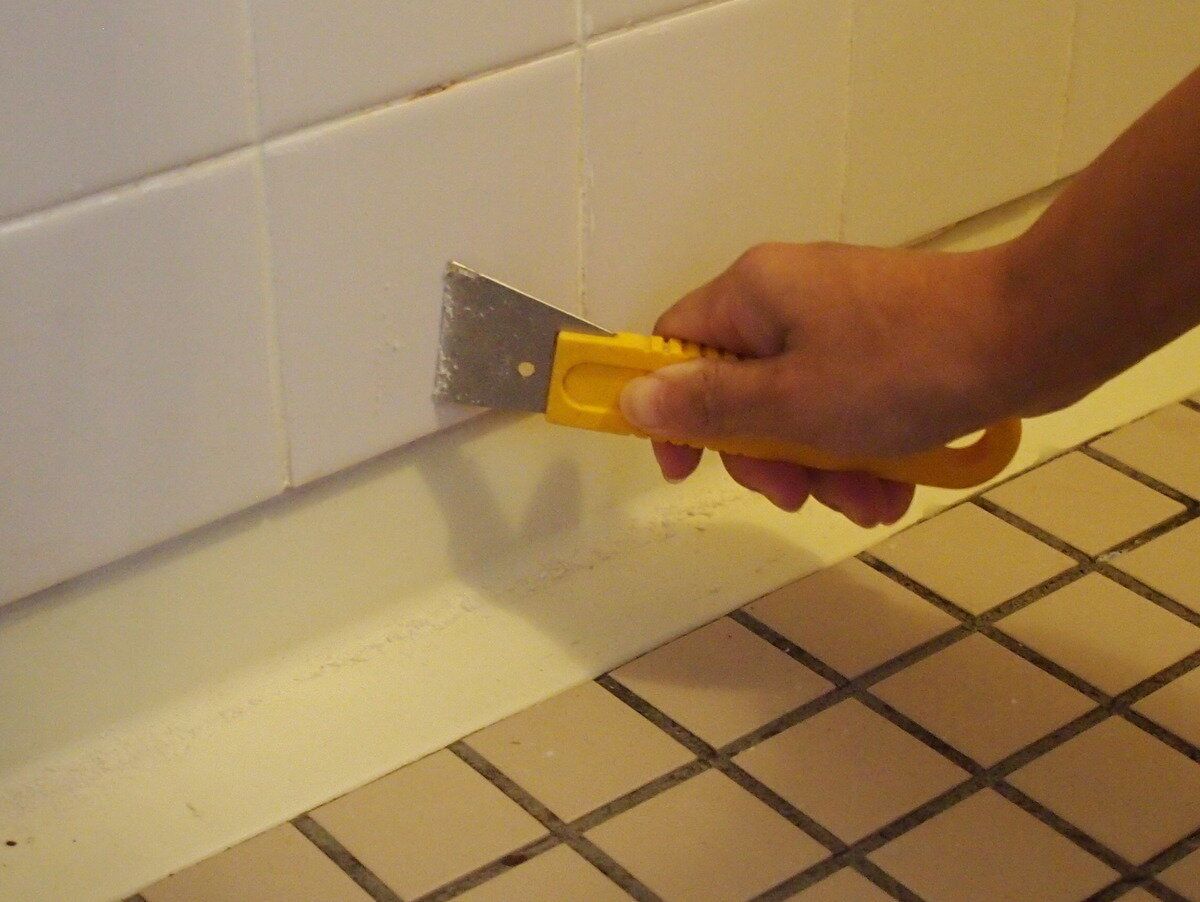 高い場所から低い場所へと掃除していくわけですが、バスタブはほぼ最後のほうになります。バスタブをきれいにしたら、床を掃除します。お風呂場は座って体を洗う場合の目線より上と下を比べると、下の方が圧倒的に汚れています。水垢なども頑固にこびりついている場合がありますので、スクレイパーなどでこそげ取ってください。