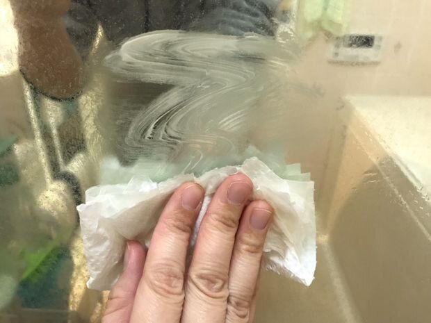 鏡をパックするイメージです。汚れが軽い場合は30分程、汚れがひどい場合は半日くらいパックしてください。ひどい場合でも半日かければ水垢が分解されます。