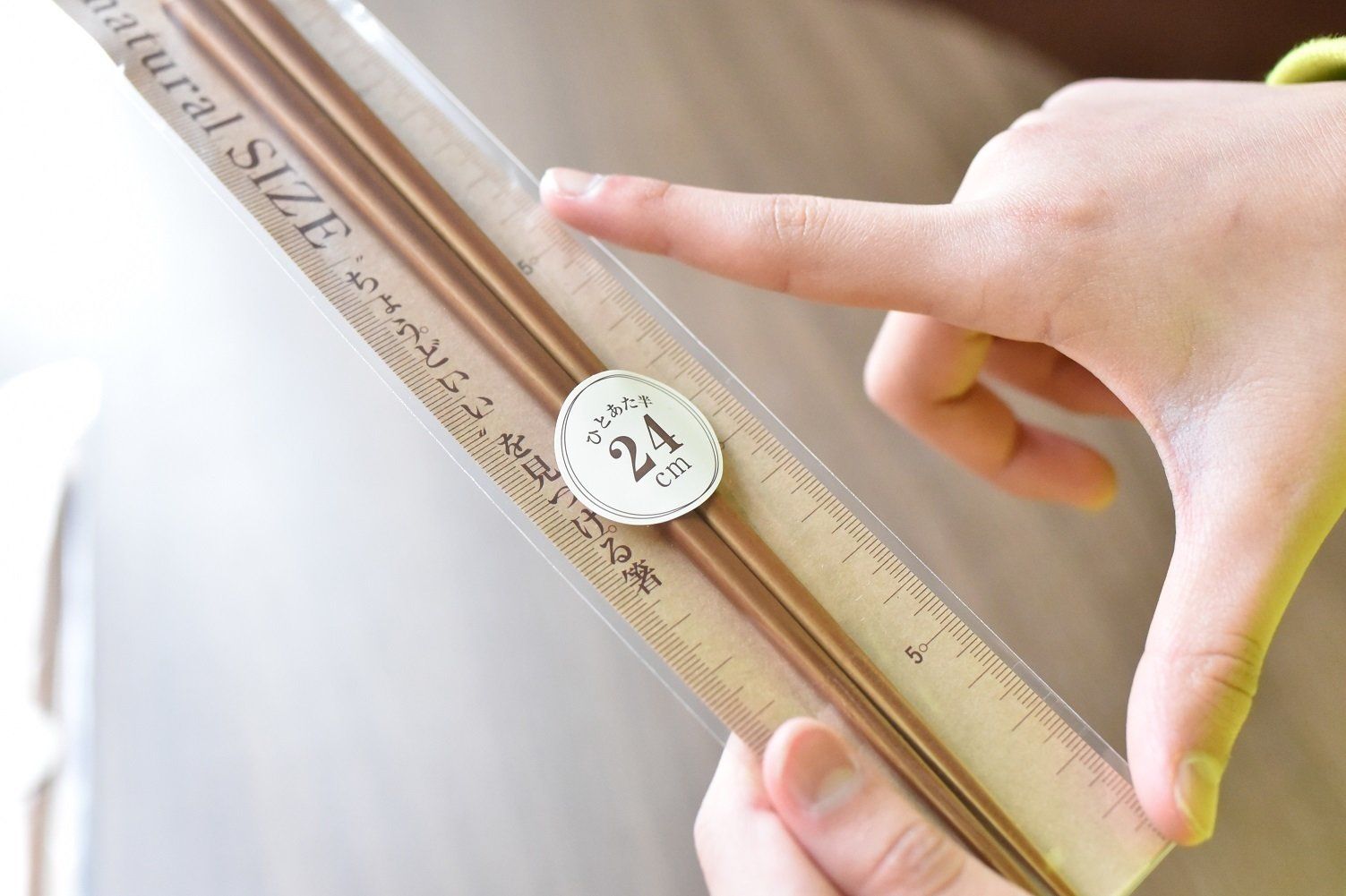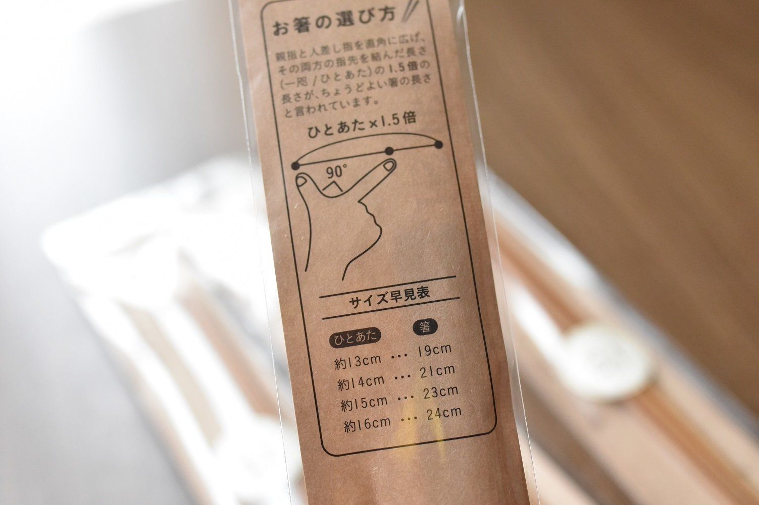 親指と人差し指を直角に広げ、その両方の指先を結んだ長さ(一咫/ひとあた)の1.5倍の長さが、ちょうどよい箸の長さといわれています。