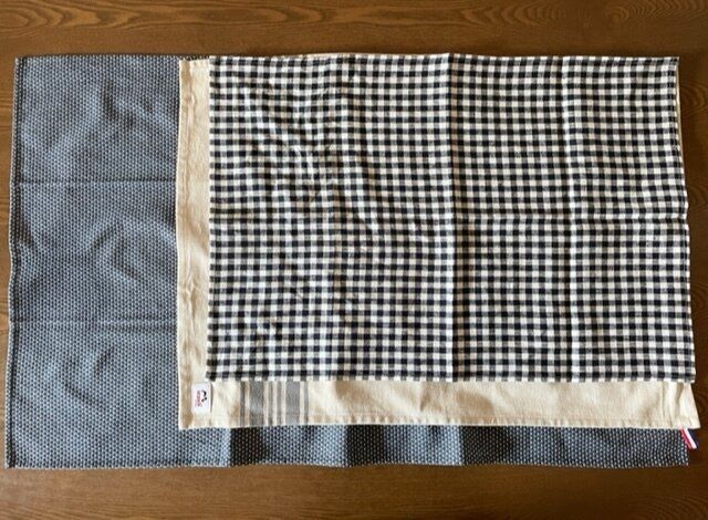 3つのキッチンクロスを重ねて比較したところ、ジョージジェンセンが一番大きく80×50cm、次がストウブで50×70cm、フォグが一番小さく45×65cmでした。