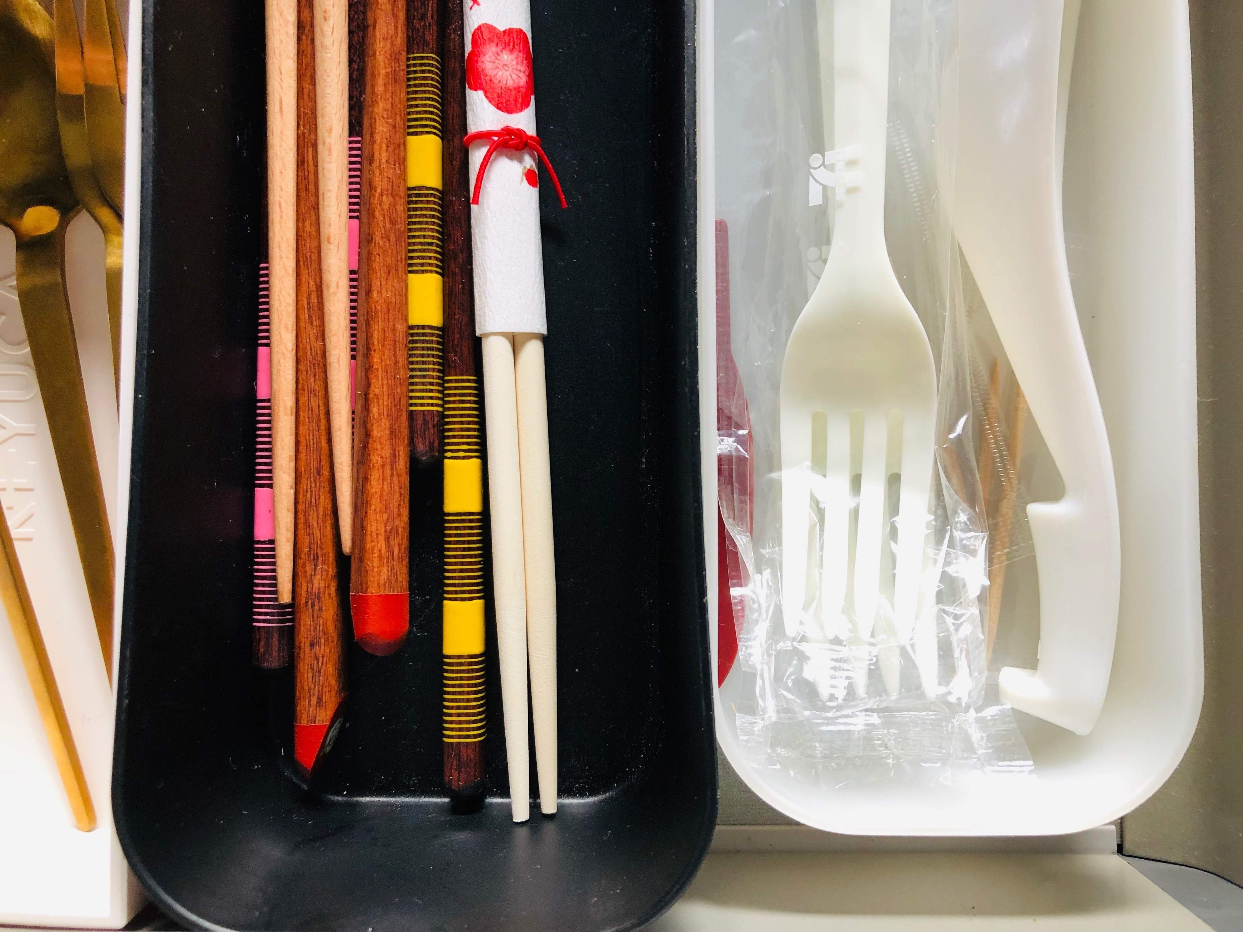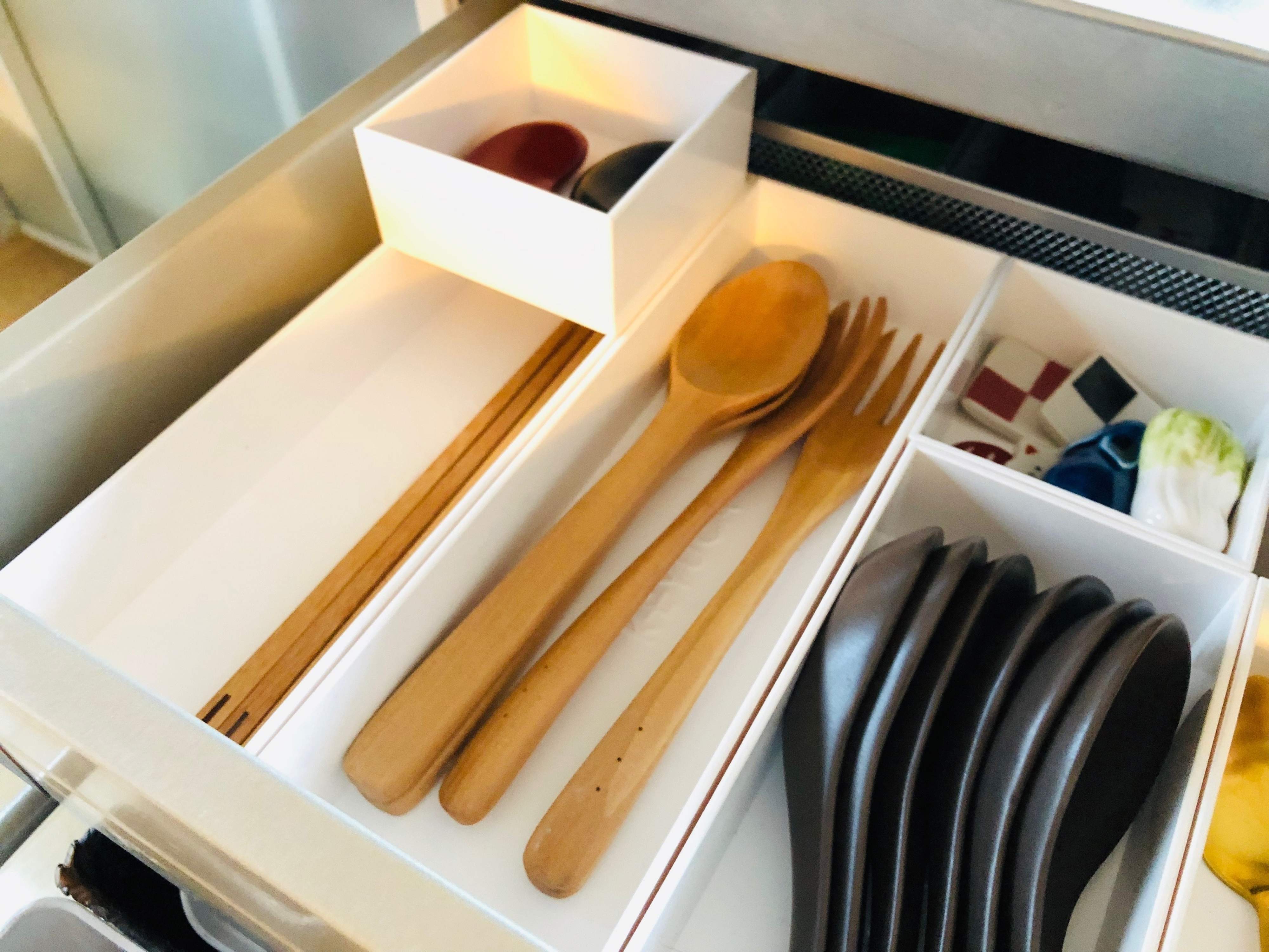 キッチンの引き出しに高さがあるなら、平面的な置き方だけでなく、2段重ねで立体的にするのもいいでしょう。