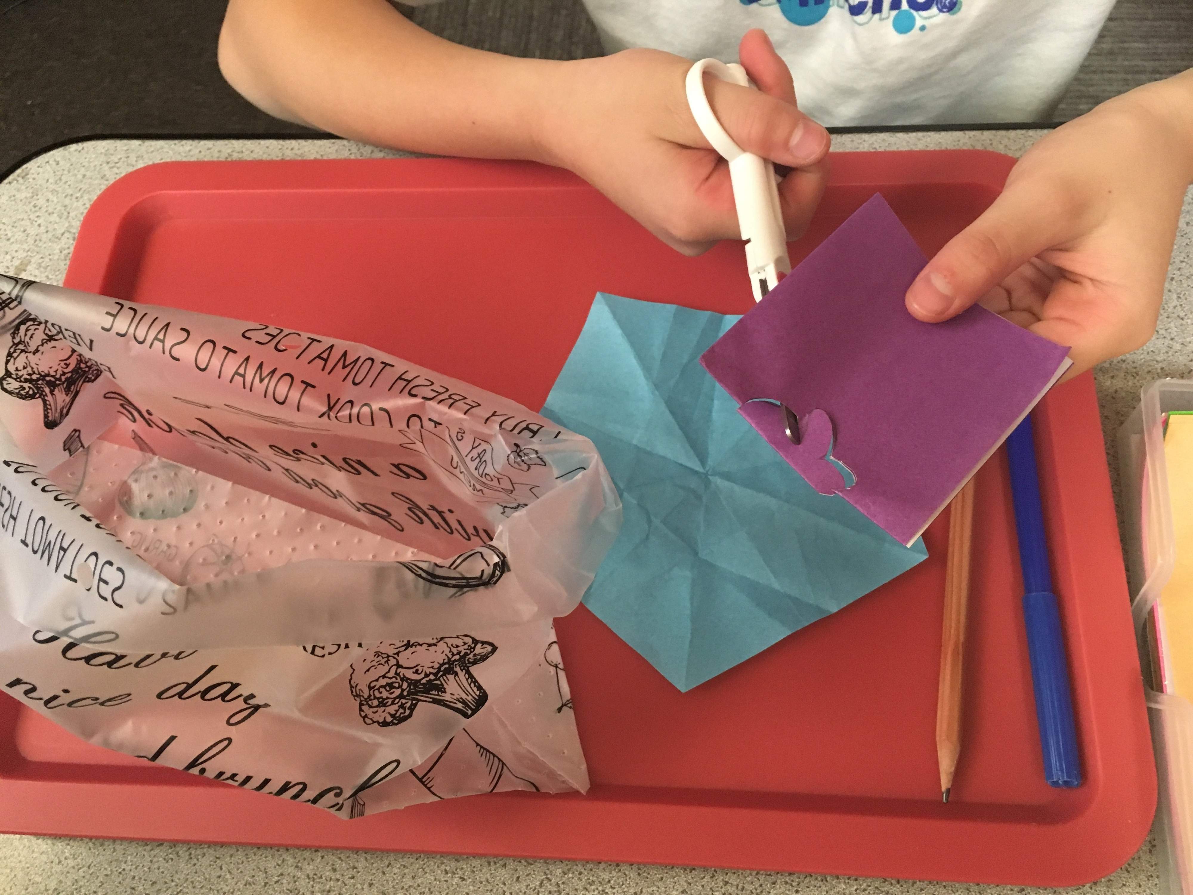 例えば、折り紙をハサミで切った時のゴミ入れに。お子さんに「ここに入れてね」と