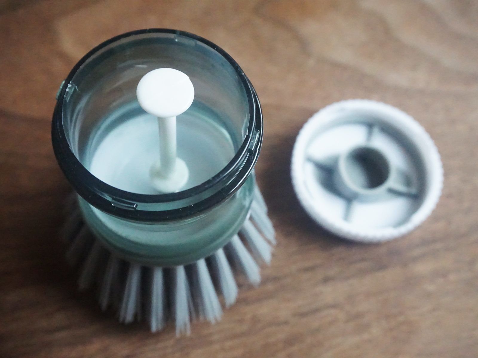 掃除に欠かせないタワシと洗剤を一体化させた商品が「便利な洗剤ブラシ」。フタを開けると、液体洗剤が入れられるスペースがあります。フタにあるボタンを押すと、中の洗剤がブラシの真ん中から少しずつ出てきます。