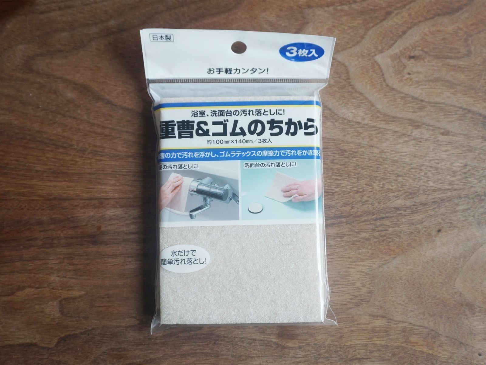 なお、水だけで汚れを落とせる商品にメラミンスポンジがありますが、キューブ型などで使われ、面が小さいため、広くこすりたい場合には時間がかかります。「重曹&ゴムのちから」はほどよい薄さと広さがあり、大きめの汚れに対しても手の力がより伝わりやすくなっています。わが家ではどちらも常備しており、汚れや箇所によって使い分けています。