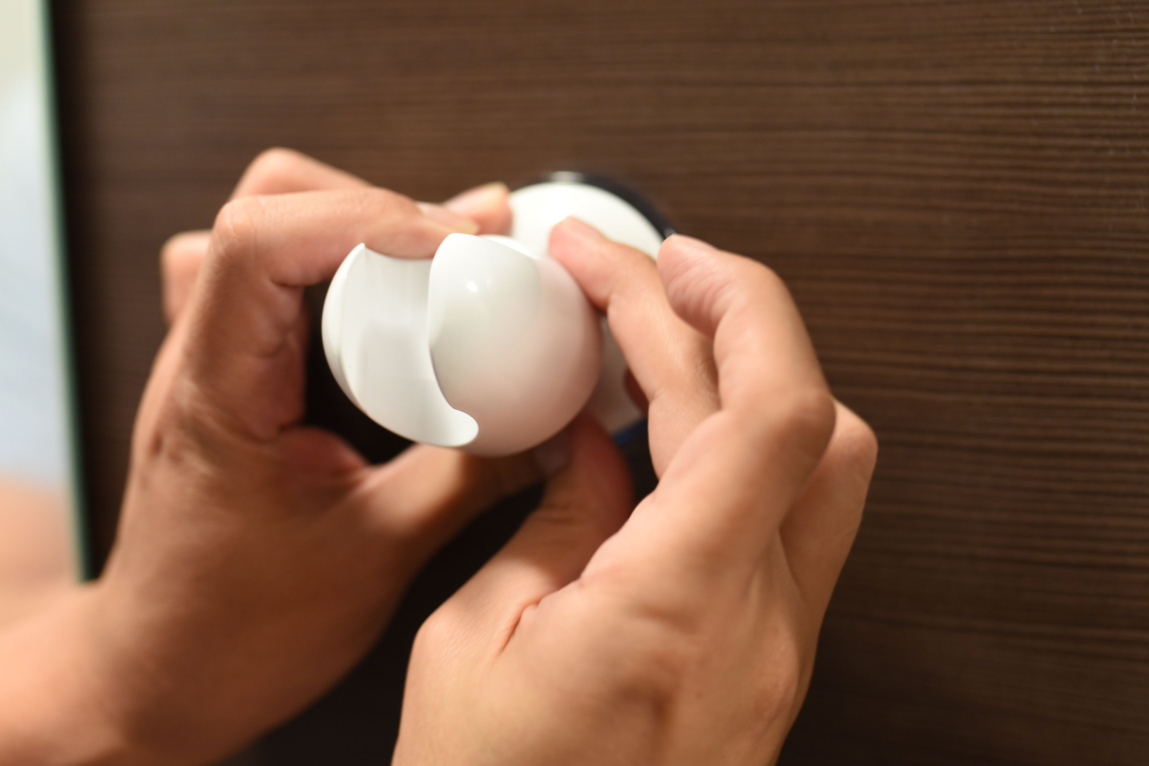 シールの上に本体の吸盤部分をぎゅっと押し付けて、本体がしっかり固定されるまで、右回りにまわします。これで、設置完了です。