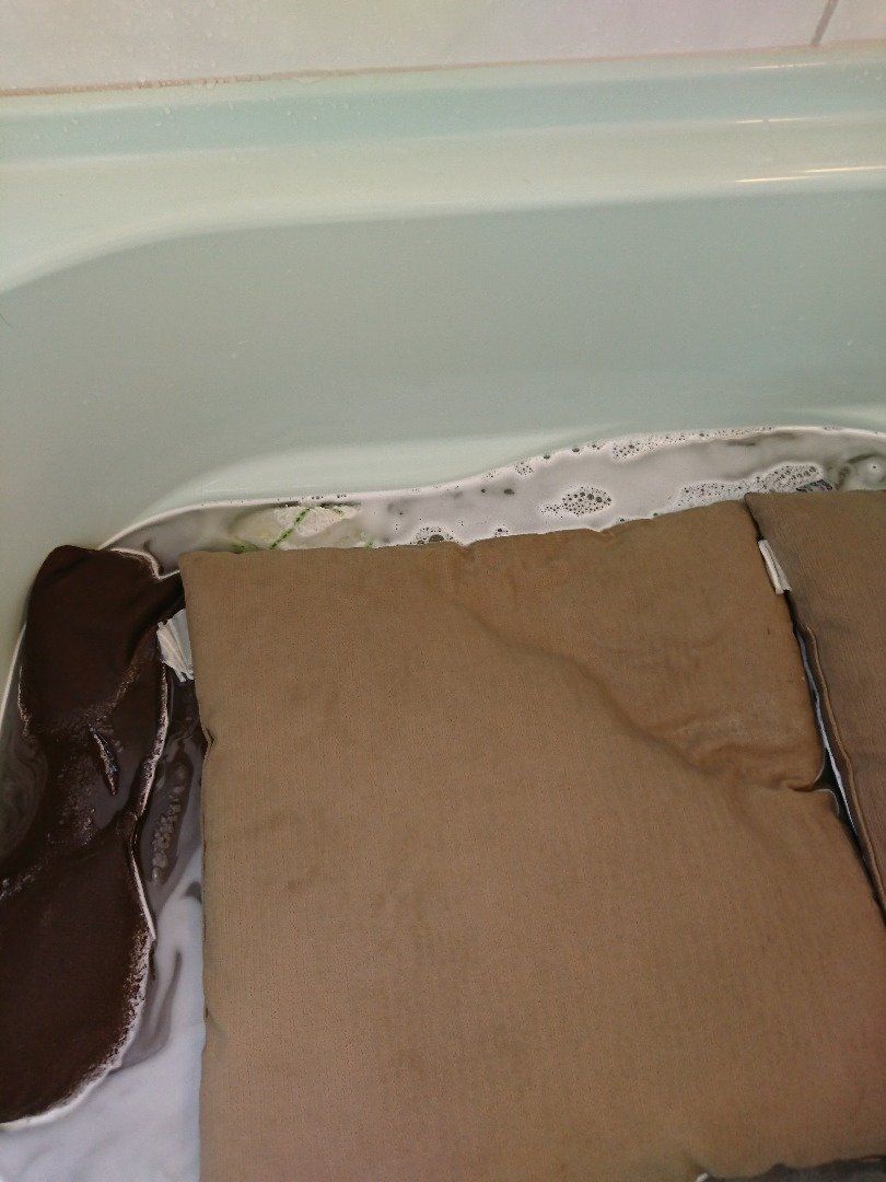 seri_chanさんがオキシクリーンを試してみたのは、クッションと足ふきマット、玄関マットなどをまとめて浴槽で漬け置きしたそうです。2時間後には浴槽のお湯が驚くほど濁り、こんなに汚れていたのかと驚いてしまいました。あとはいつも通り洗濯するだけでいいそうですよ。