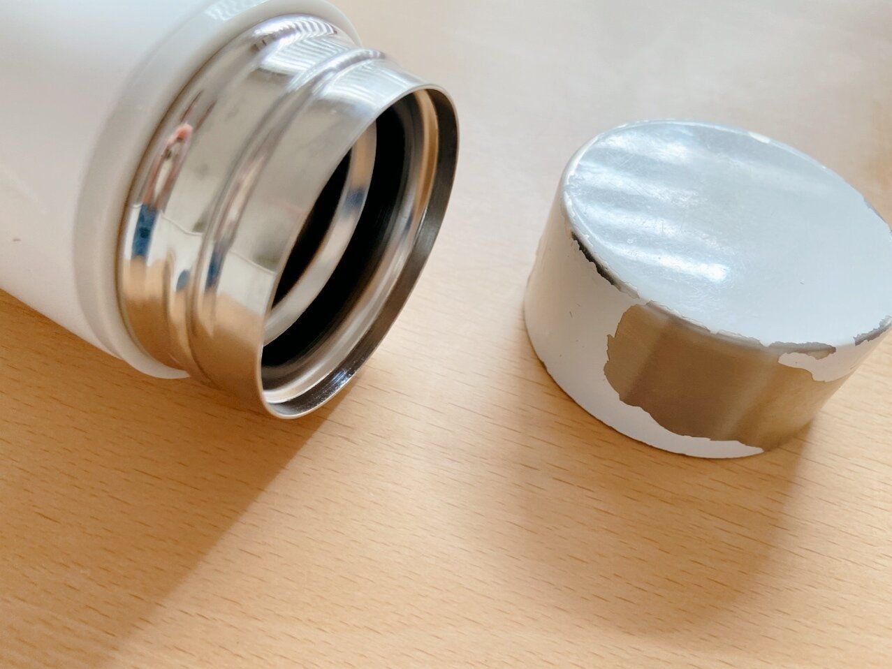 水筒の茶渋汚れにも使えるオキシクリーン。水筒のパッキンが汚れてきたので蓋を丸ごと「オキシ漬け」にしたらこれが失敗。水筒の素材にもよるのですが、筆者が愛用していた水筒の場合はオキシクリーンで外側の塗料が浮き上がって剥がれてしまうという残念な結果に。