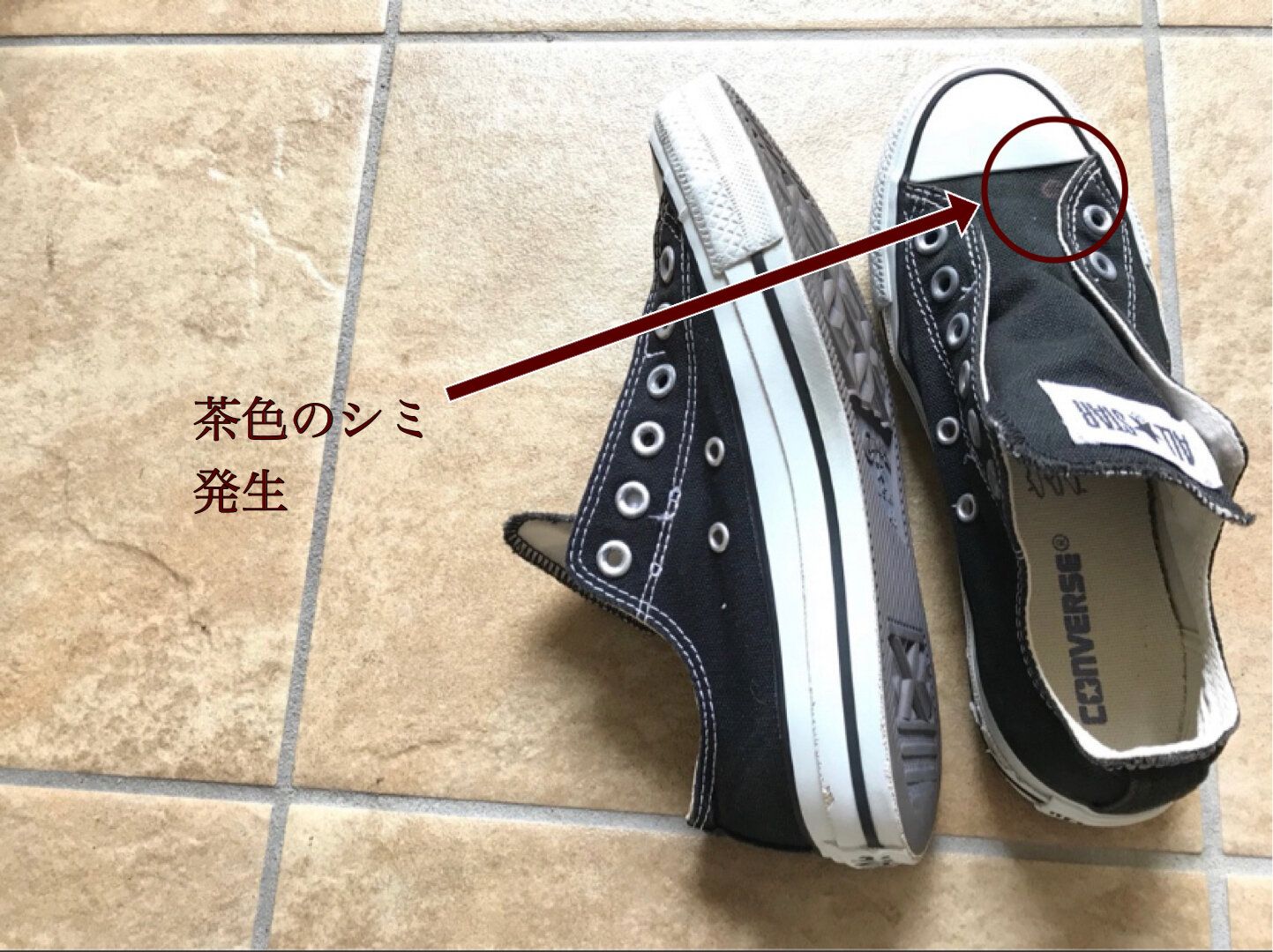 子供たちの上靴洗いでは失敗したことはなかったのですが、筆者のオキシ漬け失敗例はお気に入りのスニーカー。オキシ漬けした後手洗いして外に干していたら、茶色のシミができてしまいました。