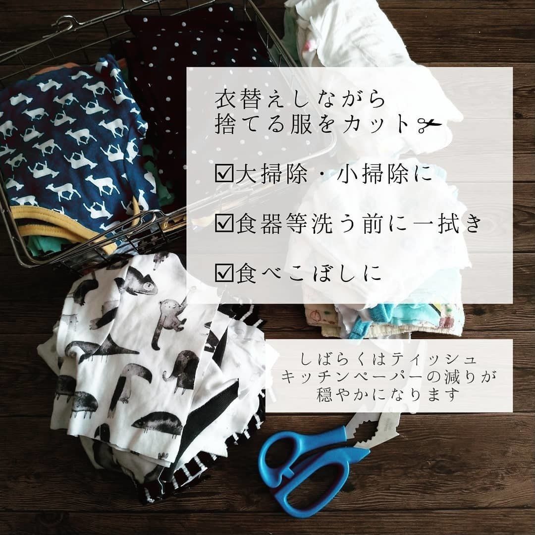 _ru_ru_mさんは、処分する衣類でウエスをつくりました。雑巾よりも目が細かいので、よく拭き取ることができるのだとか。大掃除や小掃除、食器などを洗う前の一拭き、食べこぼし用に活用しているのだとか。