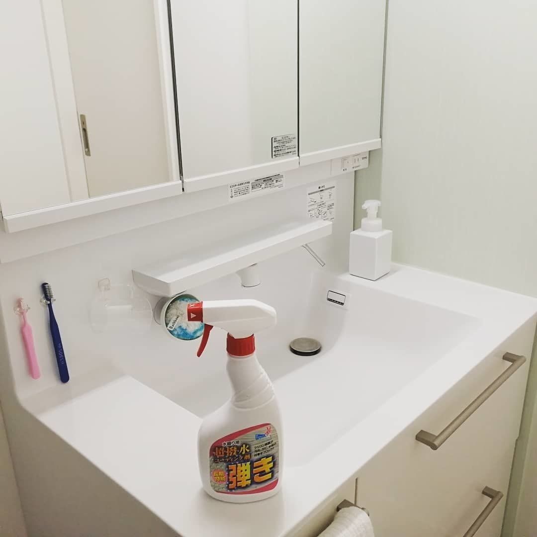 洗面台の掃除をしたimmyu3さん。洗面台用のブラシでシンクをゴシゴシと掃除したら、超撥水コーティング材をふきかけます。布で拭いたら掃除終了です。水や汚れを弾いてくれるので、掃除が楽になるのだそう。