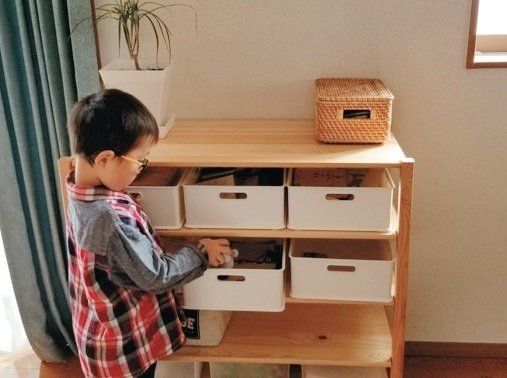 「おもちゃは種類別に細かく分けて収納しても、子どもが戻せず出しっ放しに。でも、シンプルに好きな箱に戻すだけでOKにしたら簡単で、子ども自身で片づけられるようになりました!」(トマさん)