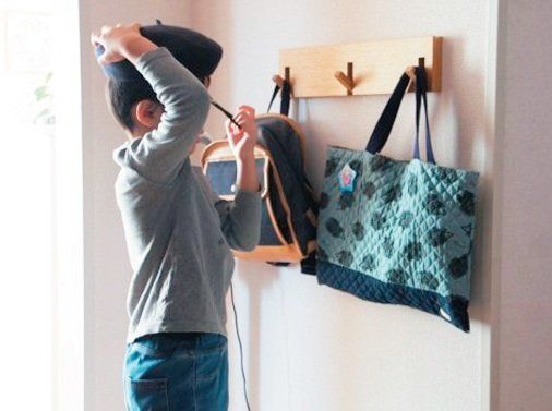 「リビングの入り口手前の廊下の壁に二男の幼稚園かばんと帽子置き場をつくりました。朝は自分で支度して、帰宅後は戻してくれて助かります。フックに掛けるだけなのが簡単でいいみたい」(Kagiさん)