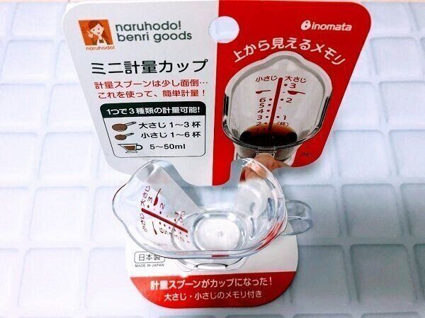 サンキュ!STYLEライターいちむらちえさんのオススメは、イノマタ化学株式会社の「ミニ計量カップ(121円)」。大さじ小さじに加え、5~50mlとこまかい量も量れる優れものなのだとか。軽量スプーンだとこぼしてしまうこともありますが、これならその心配もなし!小さいのに大きな実力の持ち主だといいます。