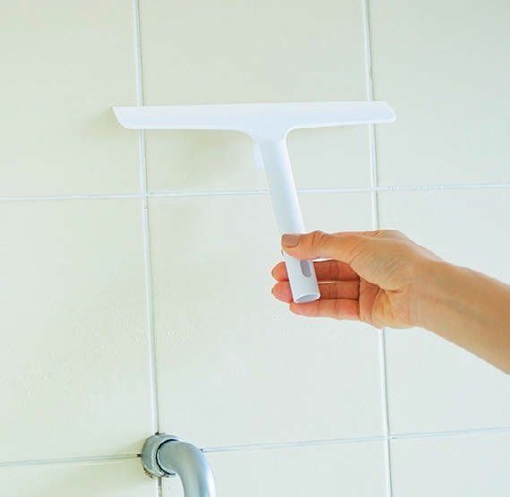 壁全体に冷水シャワーをかけたら、100均などでも売っている「T字ワイパー」で上から下に水けをきるのがカビ予防のコツ。面倒なときは、ザッとでもいいので、あらかたの水を切るのが重要です。