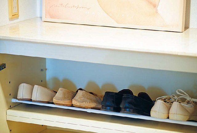 げた箱の扉を小まめに開けて換気をするだけで臭いの発生を抑制。菌の多い靴底と棚板が密着しないよう、突っ張り棒で靴底を浮かせて収納すると、通気性がよくなり効果もUP。