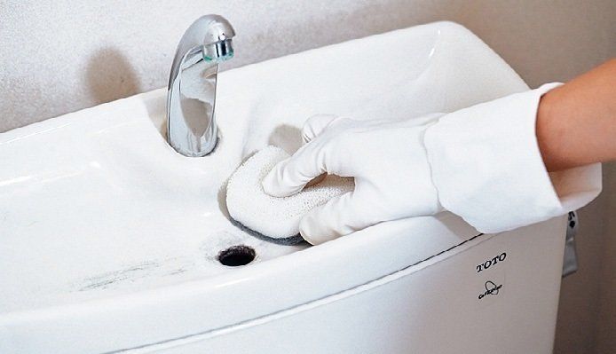 スポンジに歯磨き粉をつけ、受け皿と水栓をこすり洗いする(歯磨き粉が研磨効果を発揮)。トイレの水を流し、手洗い用の水ですすぐ。