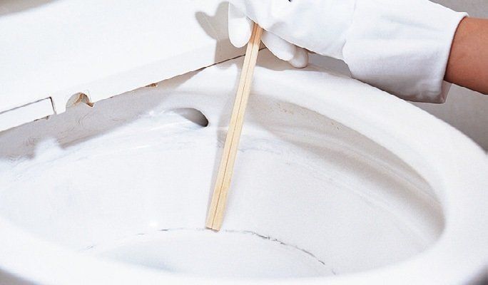 便器内の黒ずみは、割り箸の先でこすって汚れに傷をつける。トイレ用洗剤をかけて、トイレブラシでこすり洗いする。