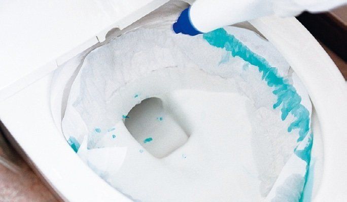 2で落ちない場合、便器内にトイレットペーパーを敷き、トイレ用洗剤をかけて5分以上おく。ペーパーを水で流してから、トイレブラシでこする。