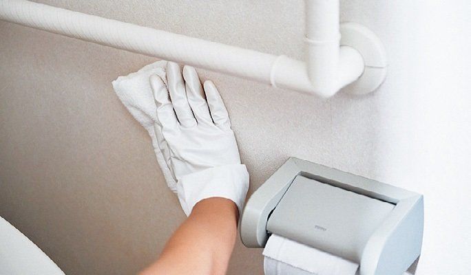 古タオルにアルカリ電解水をスプレーし、タンクのまわり、床、壁など全体を拭く。壁は下のほうに尿や汚れが飛び散っているので、しっかり拭く。