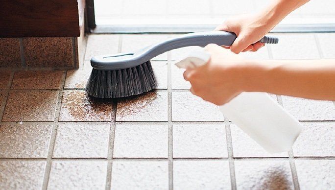アルカリ電解水をたたきにスプレーして1~2分おく。洗車ブラシでこすって汚れを落としたら、古タオルでから拭きして仕上げる。