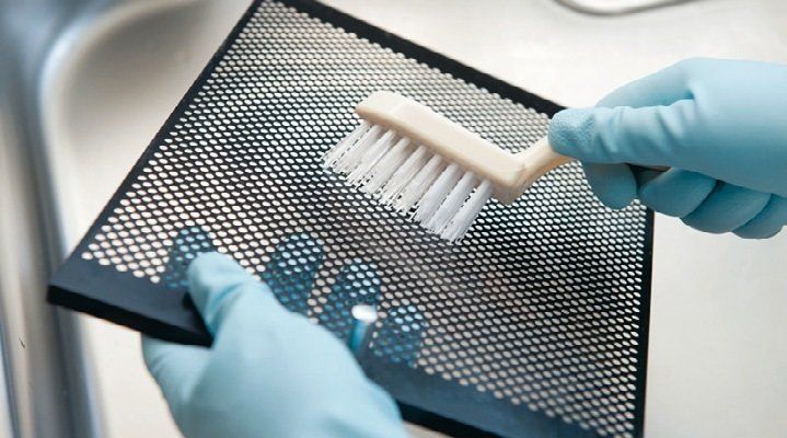 Aか、Aに半量の熱湯を加えて温まったものをかけながら、Vカットブラシか古歯ブラシでフィルターをこすり、お湯ですすいだあと、から拭き。