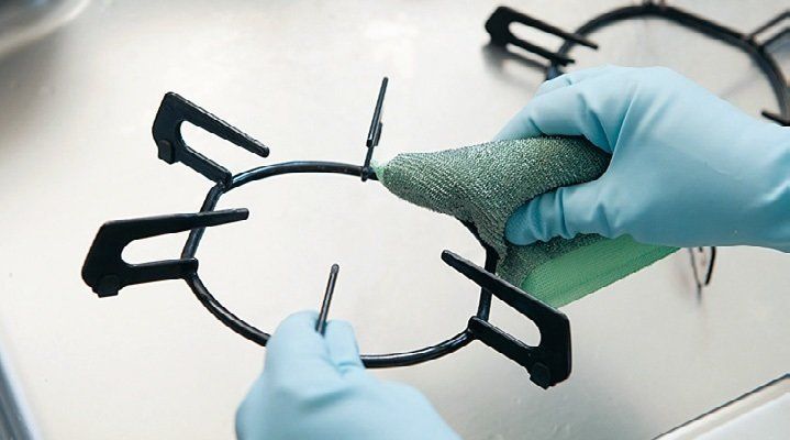 ステンレススポンジにAをつけて五徳をこすり、お湯で洗い流す。ステンレスたわしより五徳に密着するスポンジのほうが汚れがラクに落ちる。