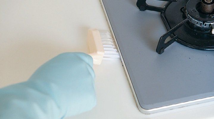 縁にすき間のあるコンロの場合は、BをスプレーしながらVカットブラシか古歯ブラシで細かいゴミをかき出す。