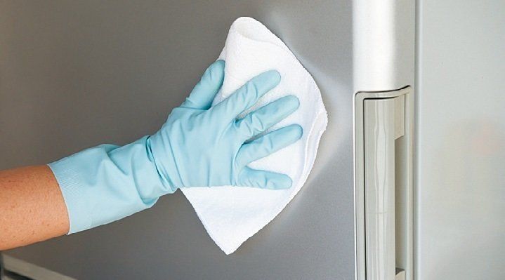 外側をマイクロファイバークロスでお湯拭きする。上部の天板部分など、汚れのひどい所は、Aをスプレーしたウエスで拭く。