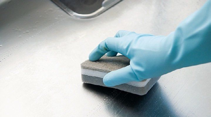 食器用スポンジにBを含ませてシンクを磨く。ステンレスの場合、丸く磨くと跡が残るので、ステンレスの目に沿って磨くのが◎。