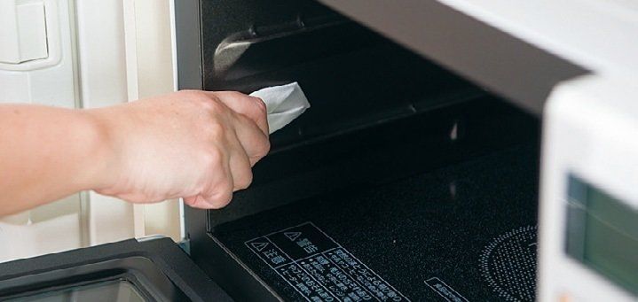マイクロファイバークロスで庫内と外側をお湯拭き。庫内にこびりついた汚れがゆるんだところで、ウエスでくるんだへらでこそげ落とす。