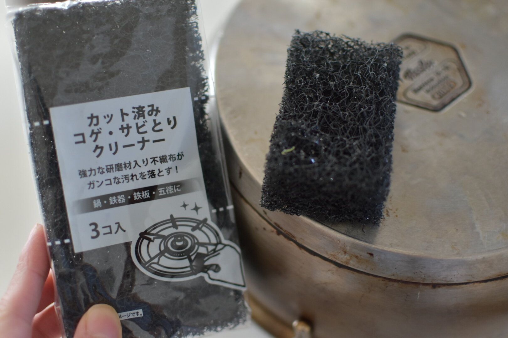 お鍋やフライパンのコゲ付きはもちろん、木製食器の軽いさびであれば擦れば落とすことができるのでめちゃくちゃ重宝しています。