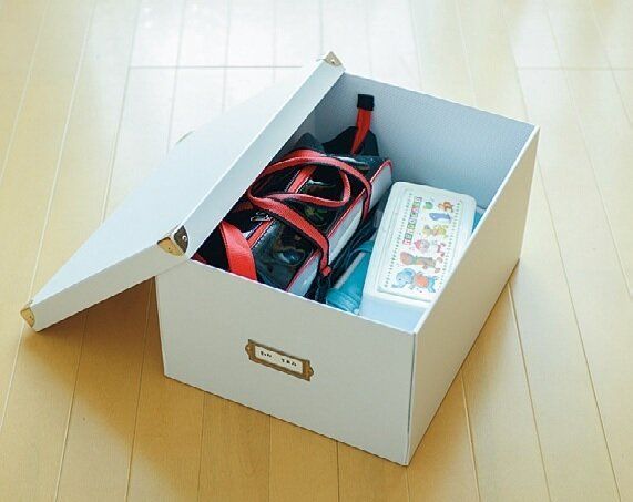 学用品は出しっ放しにしておくと掃除も面倒!一時的に増える物は折りたたみBOXにまとめて保管。新学期が始まったら、また折りたたんで収納すればじゃまになりません。