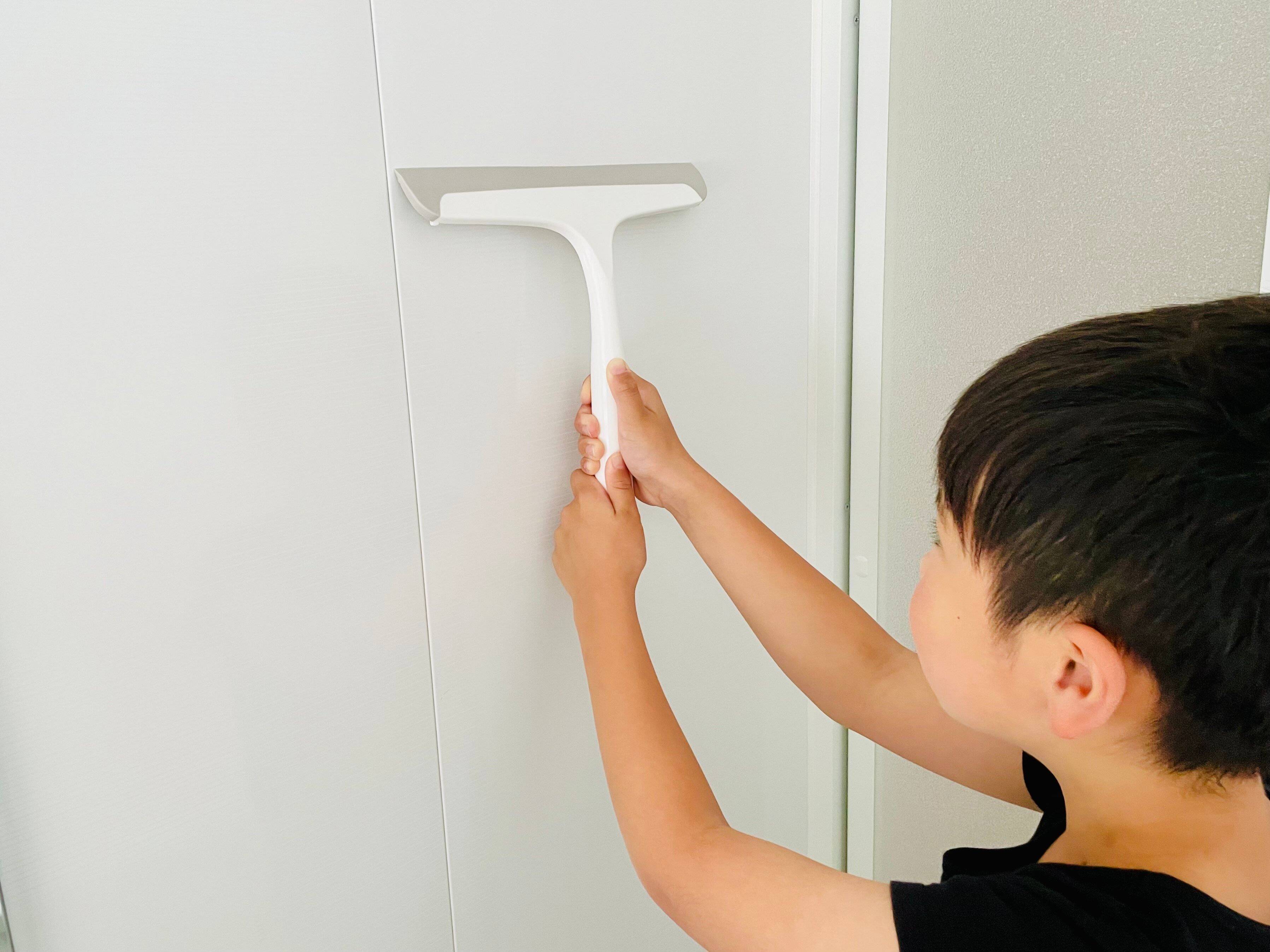 わが家では、最後にお風呂に入った人が、スクイージーで水を切る決まり。壁と床の水滴を、適当にザーッと流すだけなので、小学生の息子でも1分かかりません。