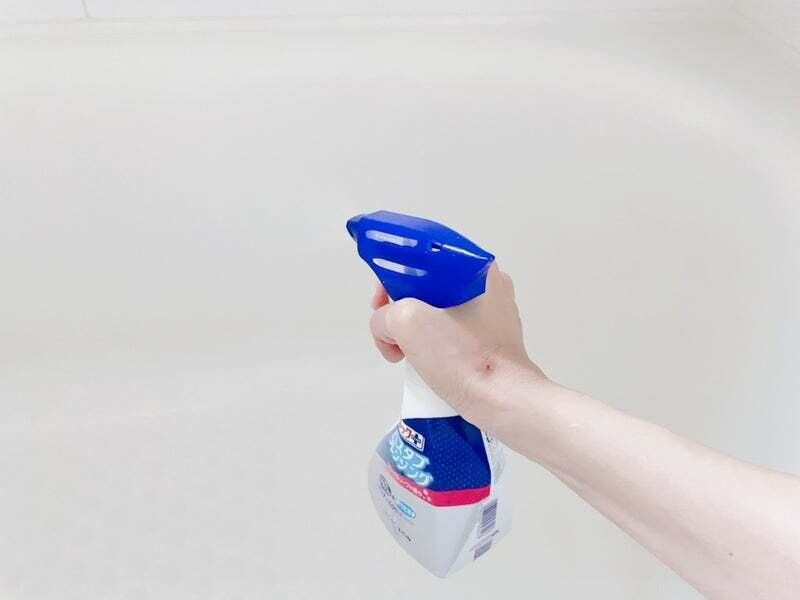 スプレータイプのクリーナーを使う上でのポイントは、浴槽からお湯を流したらすぐに濡れている状態で行うこと。そしてお湯が入っていた上部のライン近くがどうしても皮脂汚れが残りやすいので、噴射は浴槽の上限ギリギリラインを目掛けて行うことです。浴槽が濡れているので泡が上から下に流れ落ち全体を簡単に綺麗にしてくれます。