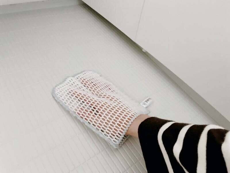 毎日水気を拭き取っているつもりでも、どうしても薄汚れてくるのが風呂床の滑り止めの溝部分。ここは毎日ではなく、ちょっと汚れているなぁ~と気になった時に、お風呂で自分の身体を洗ったついでや、週末のお風呂掃除の際に、バス用メッシュクロスで床をかる~くこすって綺麗を保つようにしています。