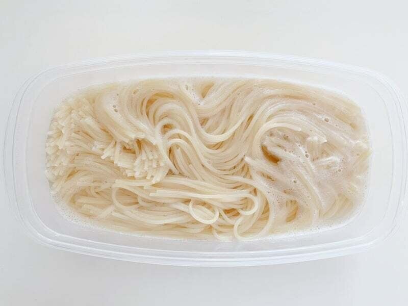 使う時は、パスタ麺を容器横に記載のある目盛り通りの水に浸水させ、電子レンジの中へ。レンチン時間は分量によって異なり、まぁまぁ時間はかかるものの電子レンジにお任せでほったらかしでOK!すっかりお鍋でゆでたとのと同じ状態になります。あとはゆで汁を少し残すようにして、そのまま具材を調理したフライパンにIN。とってもお手軽にパスタ調理が完了です。