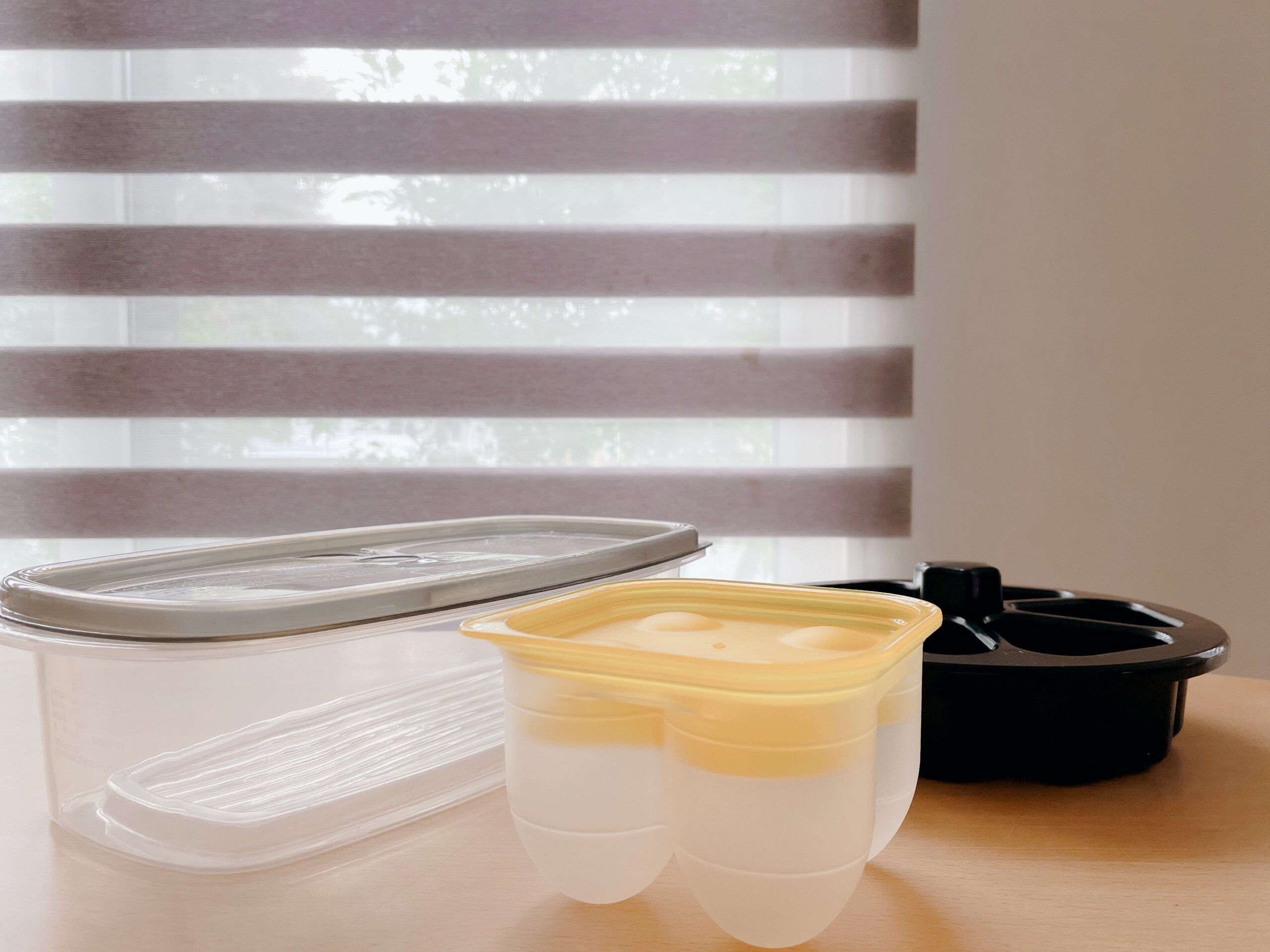 ダイソーで人気の「味付けたまごメーカー」。本体と落としフタと外フタの3点セット。使い方はとってもシンプルで、ゆで卵を4つセットし調味料100mlを投入(我が家の場合は創味のつゆ40ml+水60ml)。落としフタをして外フタをして冷蔵庫に最低1時間置いておくだけ!