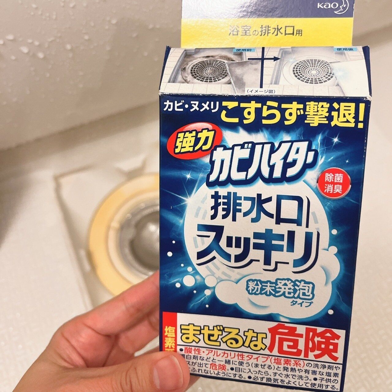 浴室の排水口は、少し掃除を怠ると、ヌメリがひどくなります。そのヌメリさえ放置していくと、カビも発生してきてしまいます。そこで、おすすめなのが、強力カビハイターの排水口スッキリです!使い方もとても簡単です。