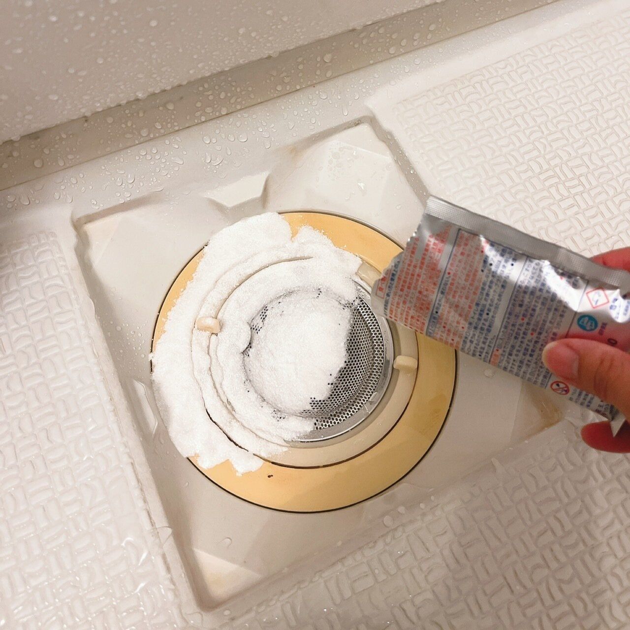 最初に、排水口に溜まっている髪の毛や汚れはしっかりと取り除きましょう。汚れまで溶かしてくれるわけではありません。大前提に、汚れは先に取り除いてくださいね。その後、粉末をふりかけます。その際に、細かい粉が舞い上がりますので、マスクをしてください。満遍なく振りかければOKです。