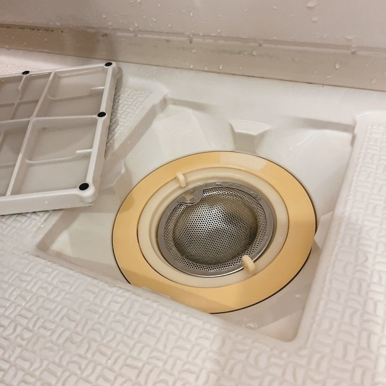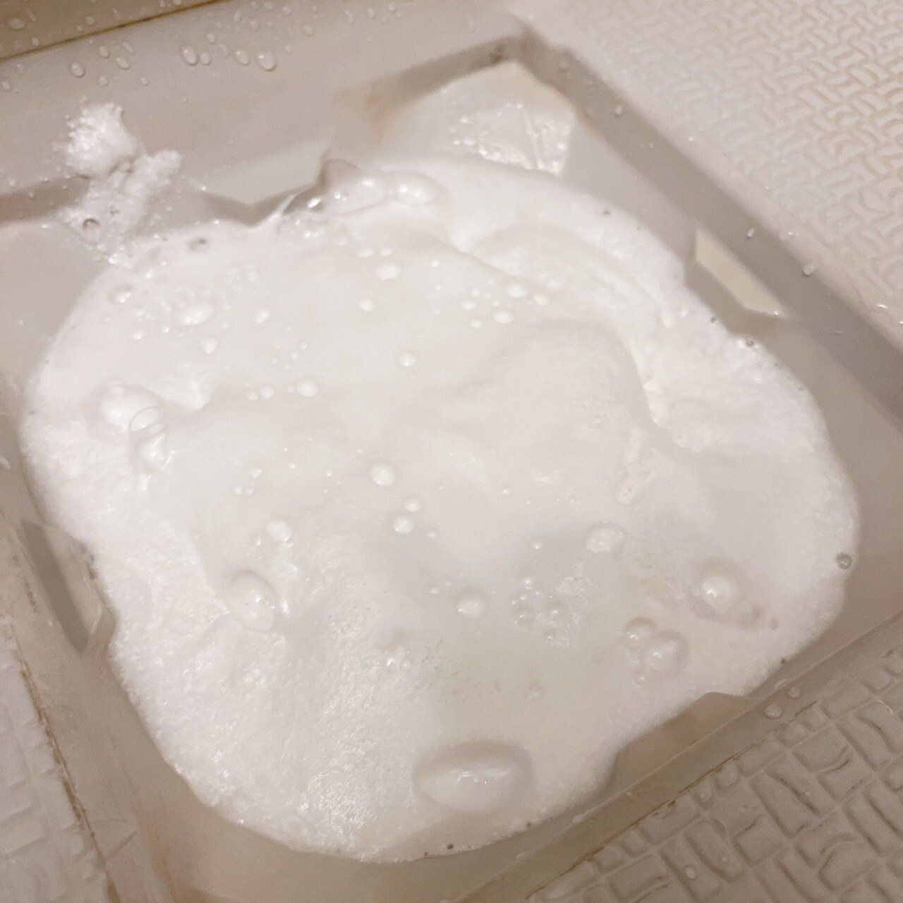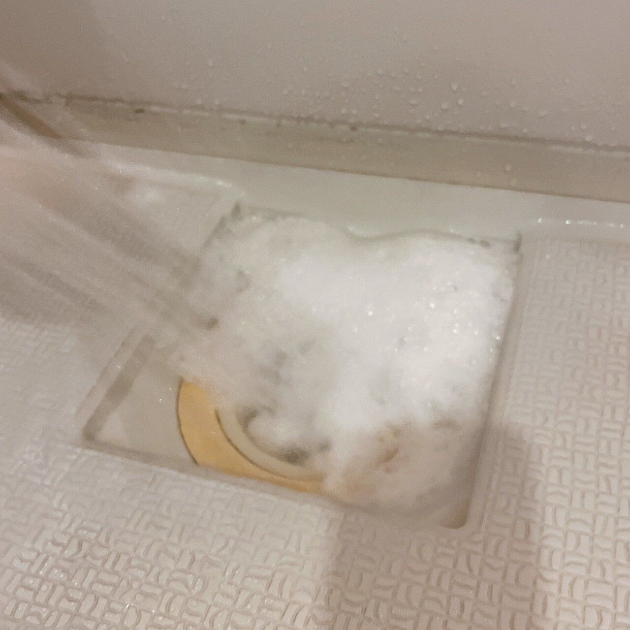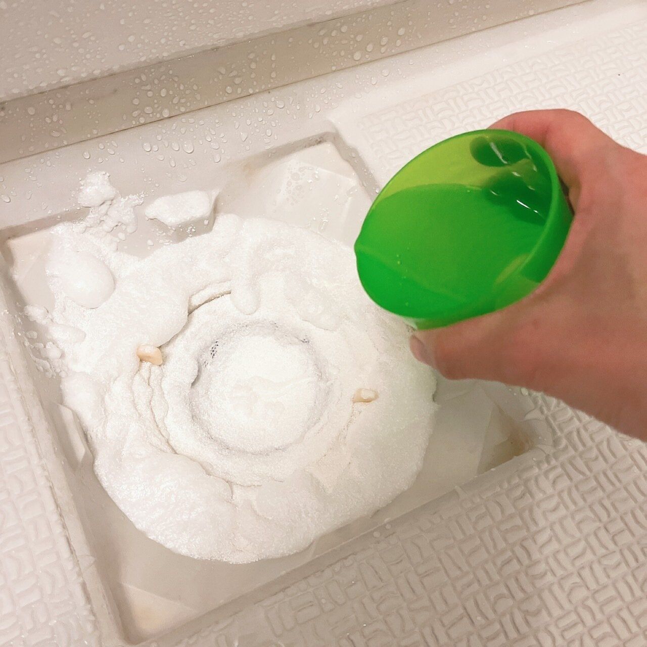 ぬるま湯をかけると、泡が発砲してきます。排水口のふたがある場合は、ふたもしましょう。ふたからはみ出るほど泡がもこもこと出てきますが、そのまま放置してOKです。