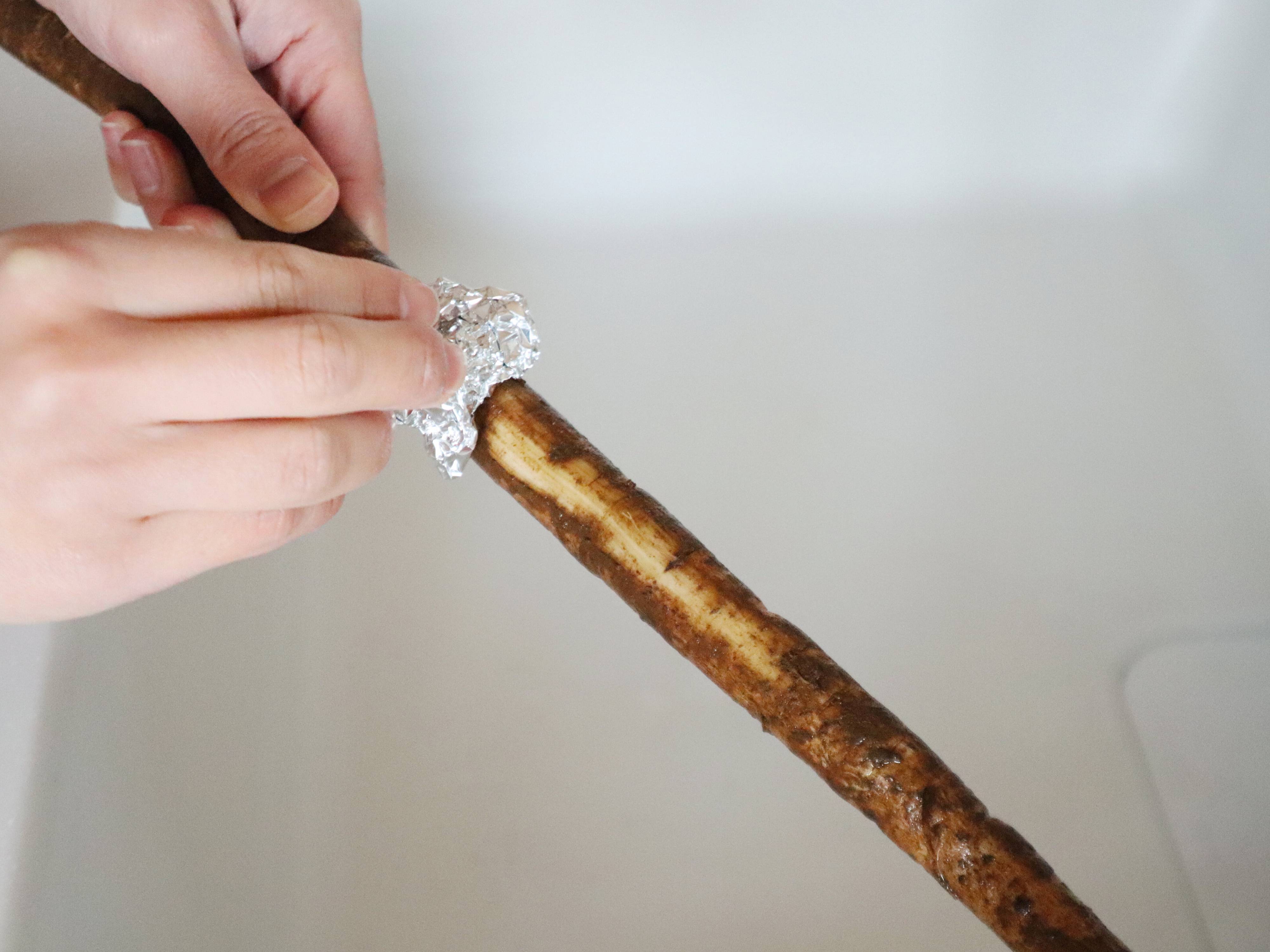 ひげ根が伸びているところも、アルミホイルでササっとこするだけで簡単に取れるので、部分的に皮をむく必要もありません。