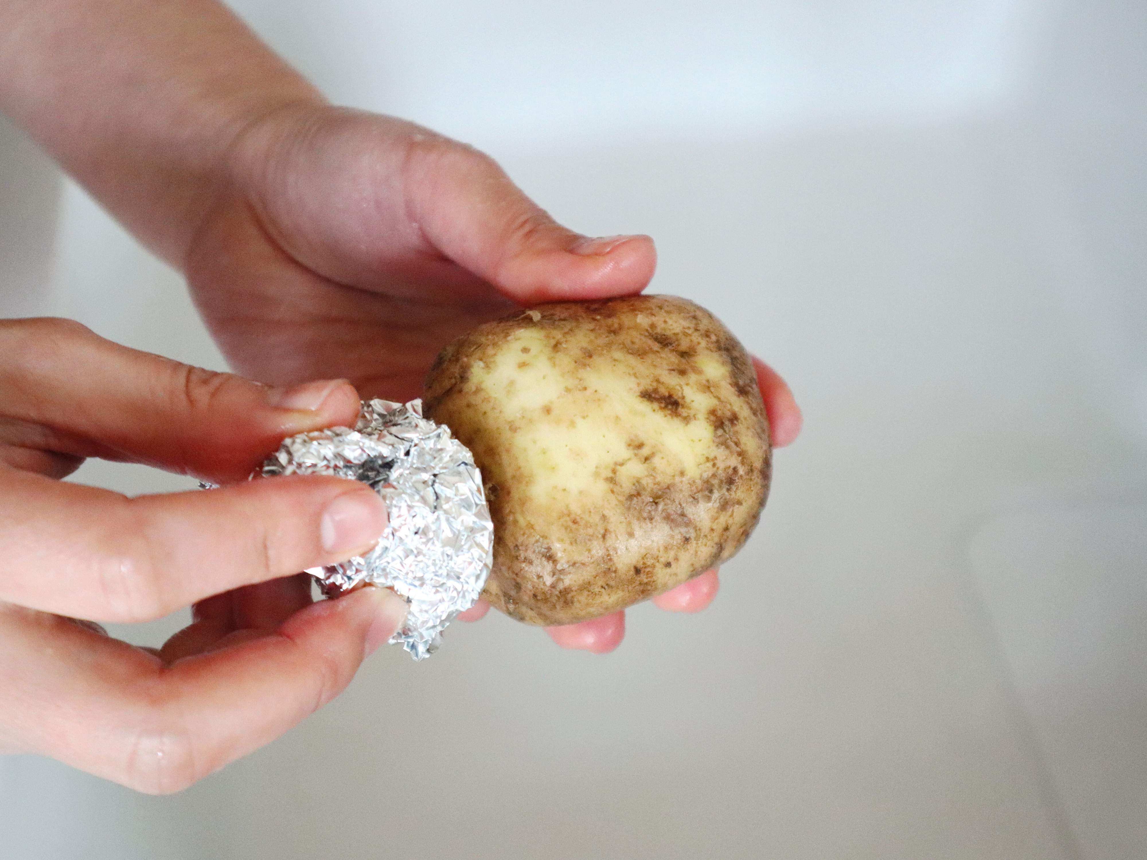 皮をむかずにつくる料理では、土の洗い残しがないようにしたいですよね。とくに、芽のまわりは洗いにくいですが、アルミホイルの凸凹を押し当ててこすると、洗いやすくなります。