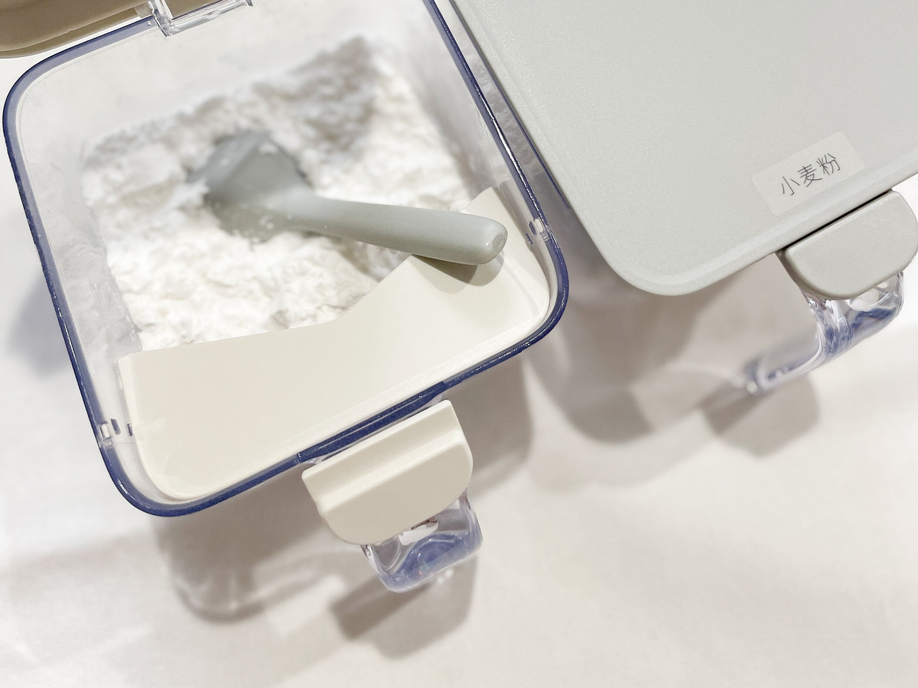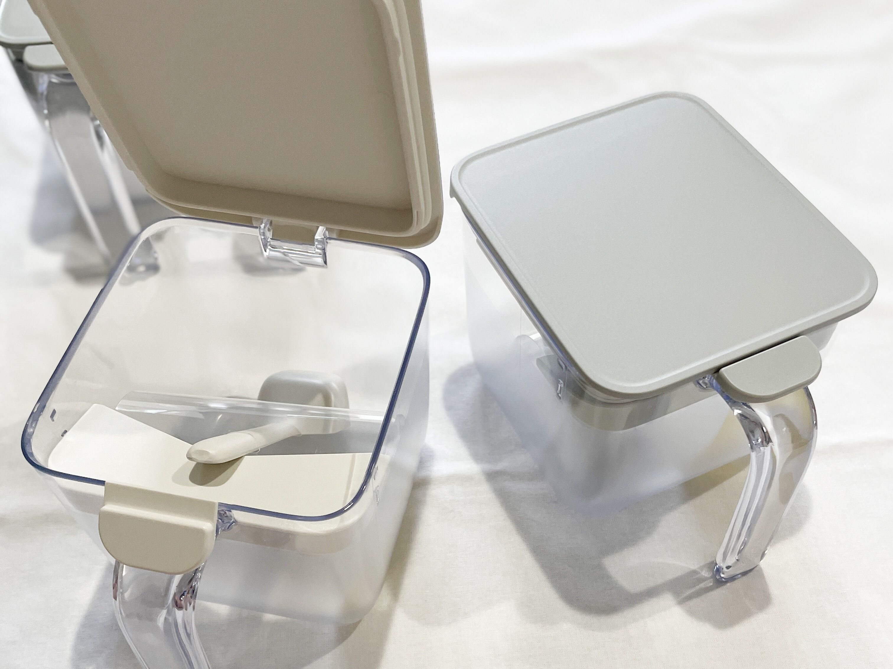 手前にある、すり切り板ですくいながらすり切りができ、この板に立てかけるとスプーンも埋もれない設計になってます。